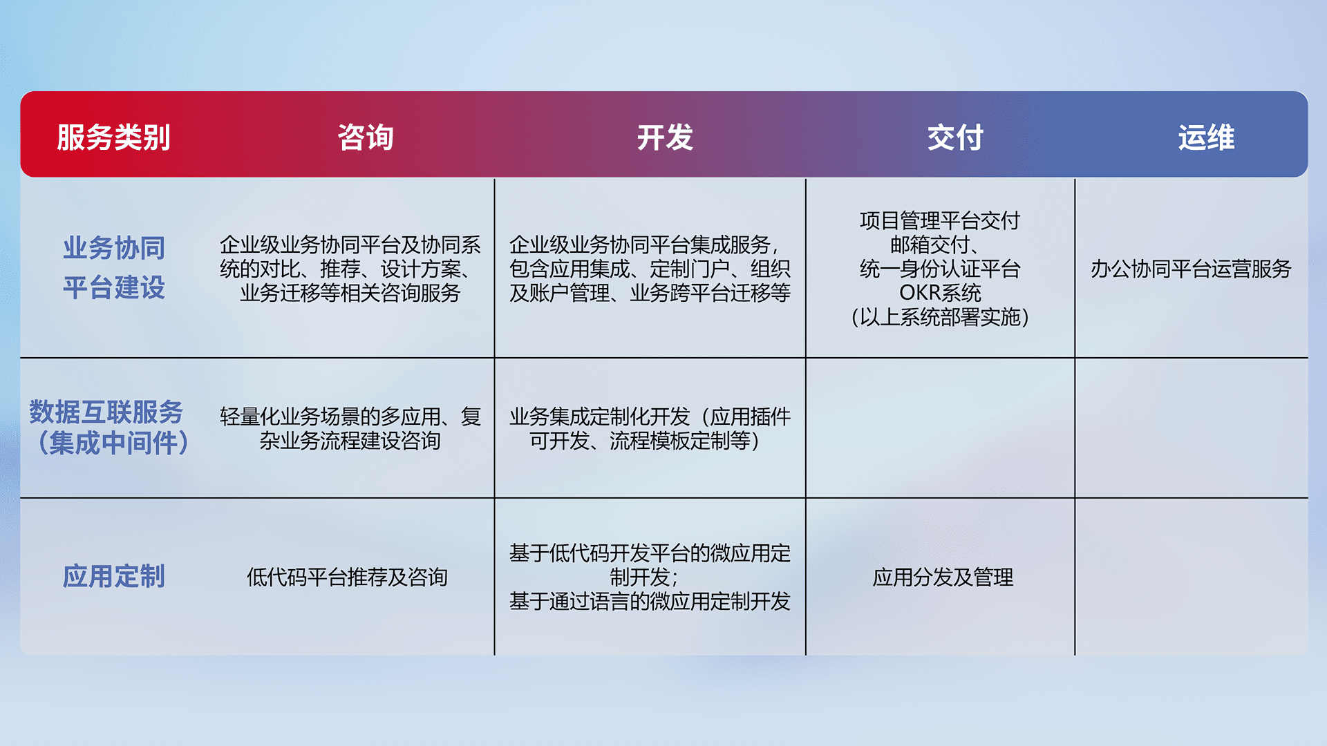 针对钉钉、、企微、、、、IDaas等平台级产品提供产品的规划、、方案、、交付、、定制化开发等服务,,实现如统一协同办公、、智能客户服务、、、混合会议管理、、、智能数据查询、、等业务场景,,,实现数字化转型。。。。