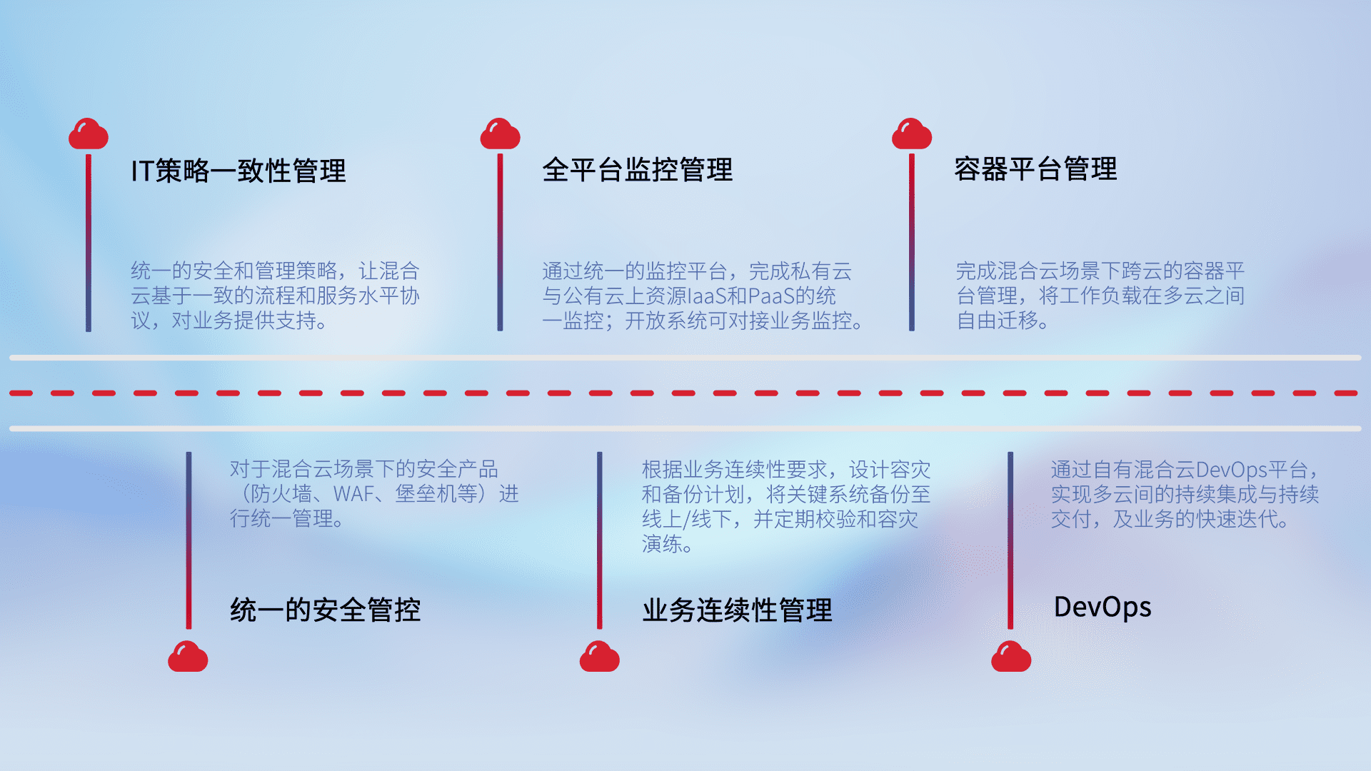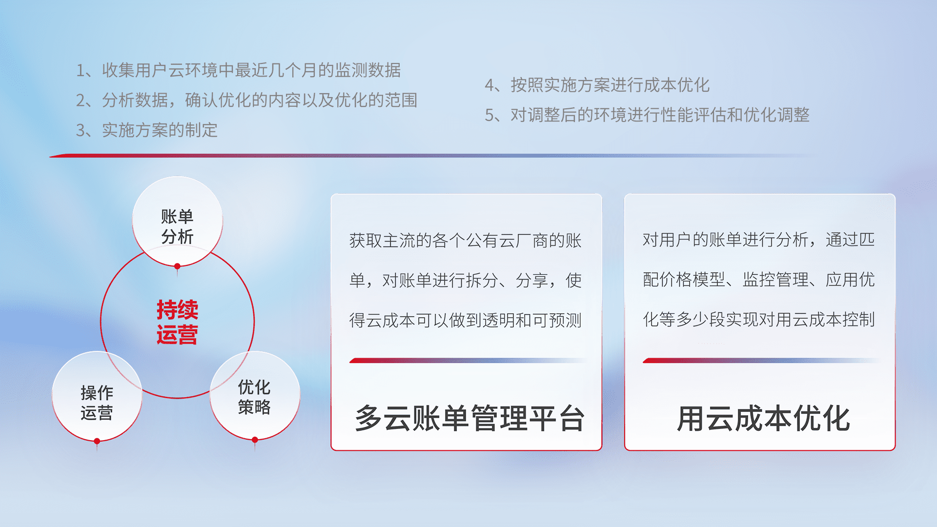 通过多云纳管,,,,以统一的资源数据模型把客户的云资源进行抽象和封装,,进而实现对多云资源的统一操作,,,保障云资源管理的可靠性、、稳定性与可用性。。。。量身定制化运维内容,,,配置、、、开发运维、、、、补丁管理、、、备份、、、、监控、、认证和访问管理、、、审计和日常巡检等,,,,保障在用云过程中的可靠度,,稳定度以及高可用率。。。