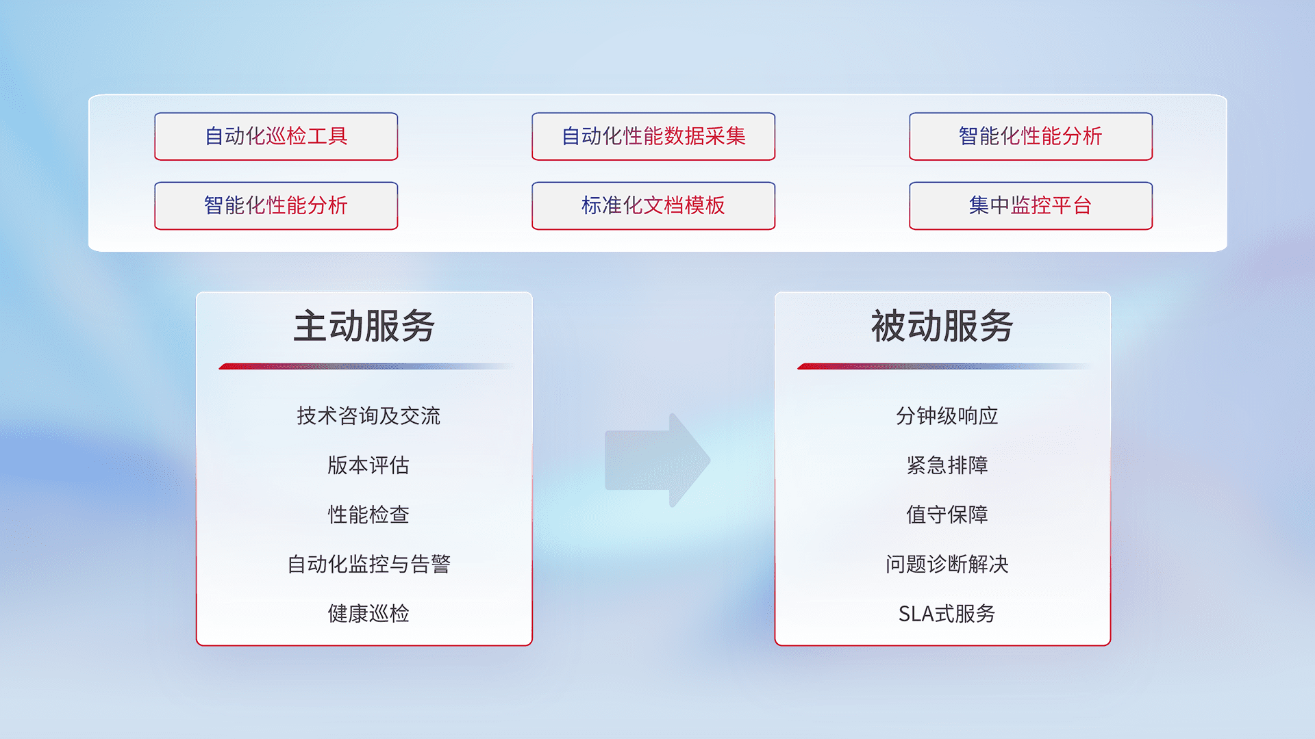智能化工具和标准化文档,,,保障服务质量,,,,提供主动服务(包含技术咨询、、、版本评估、、、、性能检查、、、自动化监控与告警、、健康巡检)和被动服务包含(分钟级响应、、紧急排障、、、值守保障、、、、问题诊断解决、、SLA服务)。。。。